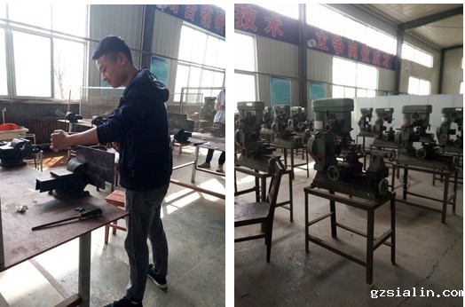 实训室主要设备有:砂轮机、台式钻床、钳工操作台及台虎钳。数控攻丝机,钳工实习间总面积有200平方米。
