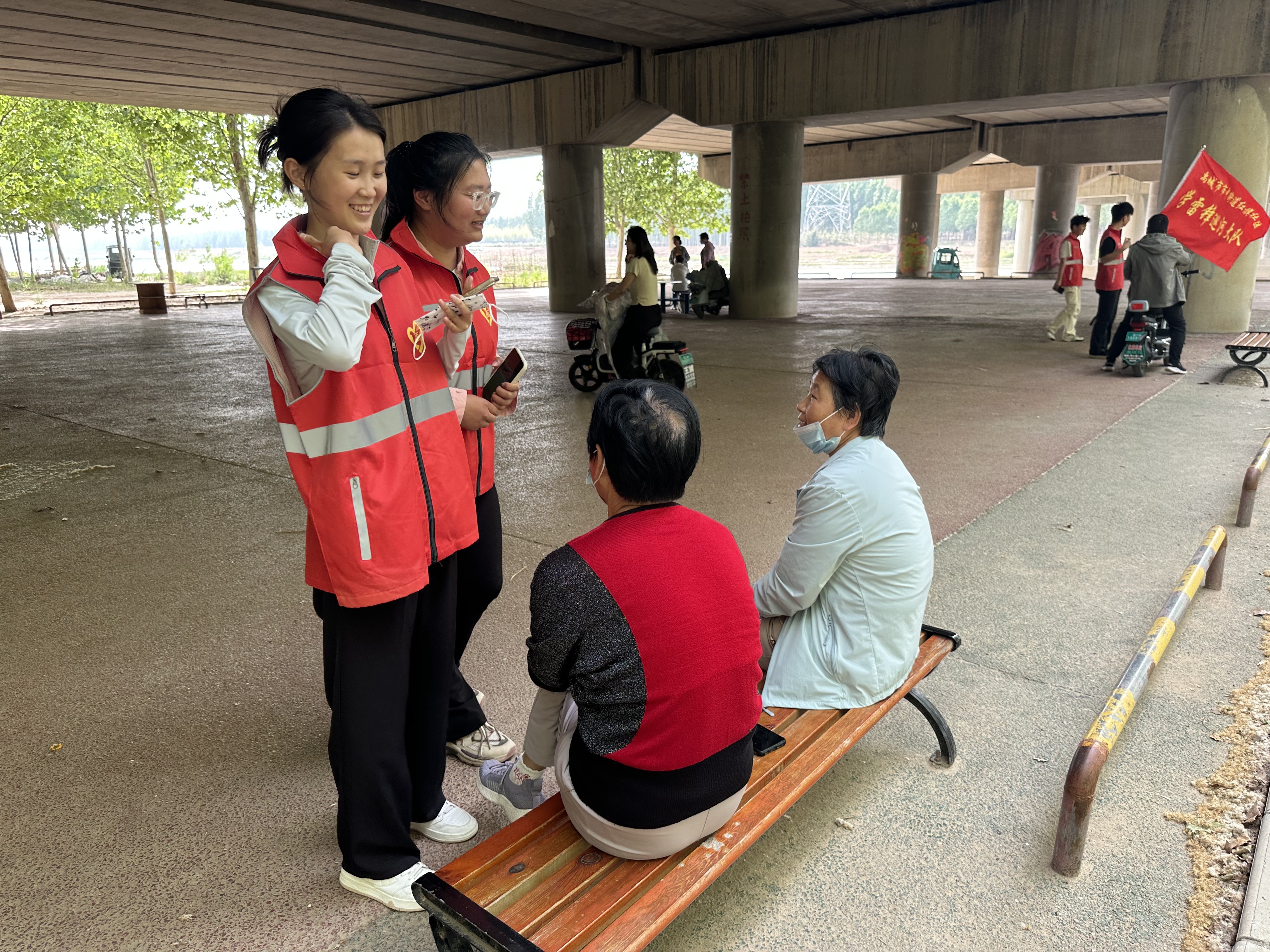 随后,我院志愿者们走进河边凉亭处,为休憩的老人们送上暖心关怀。我院的志愿们结合真实案例,用通俗易懂的语言,耐心细致地讲解防溺水知识,提醒老人照看好身边的孩子,远离危险水域;同时针对养老诈骗常见套路,详细介绍防范要点,叮嘱老人守护好“钱袋子”。
